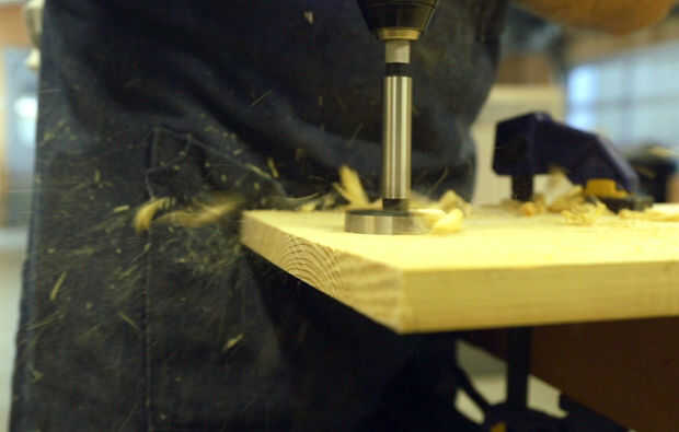 Con mi diseño de la computadora como una guía, perforé las aberturas de la estantería para aceptar los postes de compresión. Después de la impresión perforado todas las aberturas, luego limpiar los bordes con lija áspera.