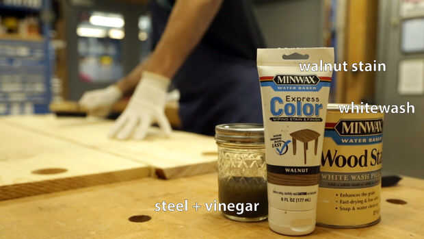 Después de angustiosos aplica una solución de té y vinagre para darle un aspecto envejecido, entonces aplica una mancha de nueces para oscurecer las juntas, finalmente apliqué una lechada mancha que aligera el aspecto y suaviza las manchas debajo de conserva en vinagre.
