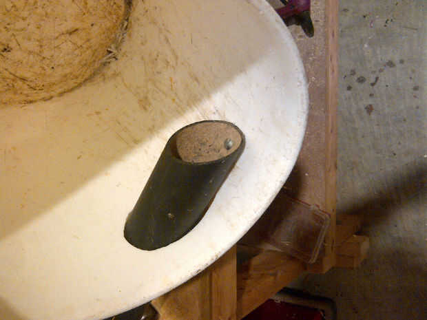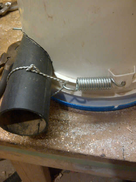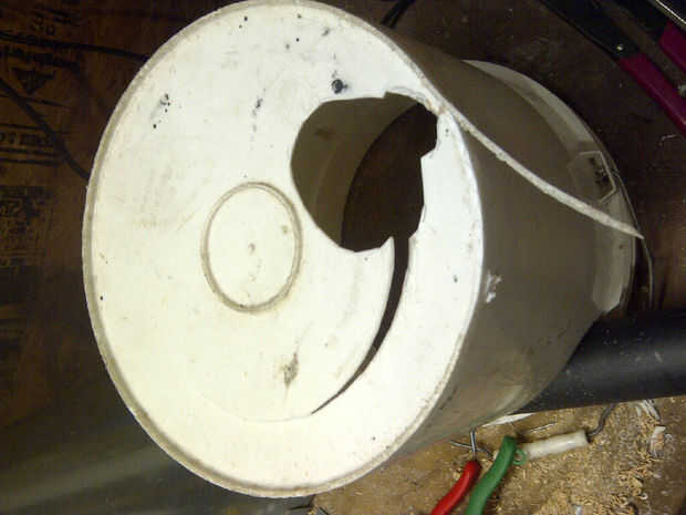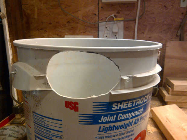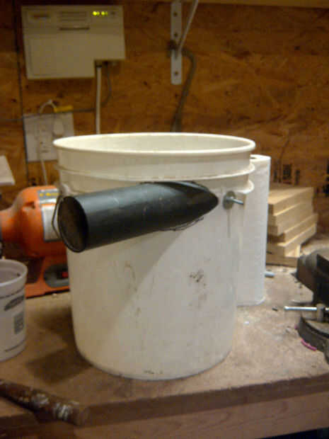El punto del cañón es iniciar el remolino.   Esto se hace permitiendo que el flujo de aire de entrada a pasar tangencialmente.   Usé una extra 2" tubería de plástico de una vieja aspiradora de taller como la entrada al cañón.   Fue un poco complicado cortar el agujero en el barril para permitir la entrada tangencial.  Se recomienda hacerlo lentamente para obtener sólo el tubo para deslizarse en el agujero.  El agujero termina pareciendo una lágrima.  Utilizar algún sellador para llenar los vacíos.  Por último, se corta la parte inferior del cubo para formar el cañón.