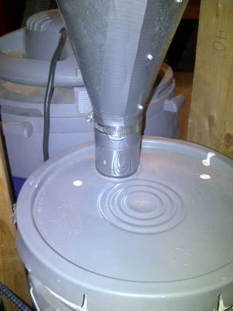 Este es mi sistema de ciclón de vacío casera. Se cuenta con dos cubos de pintura vacía y algunas mangueras de vacío.La mayor parte del polvo y las partículas permanecen en los cubos y sólo una pequeña parte del polvo fino se va a la bolsa para vacío.