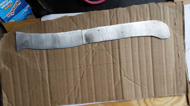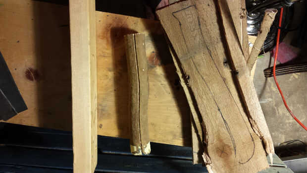 Encontrar un tablero adecuado con algunos patrones de buen grano y luego marque la silueta con un rotulador. Se puede utilizar una sierra de mano, pero sólo usé una sierra de calar para cortar la pieza de mango (que ahora se ha convertido en una escala. Sí, una escala. Eso es justo lo que se llama ahora. No sé, simplemente siga leyendo!).