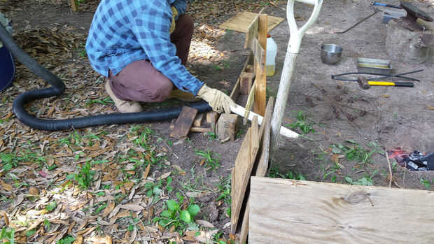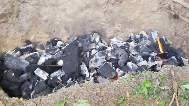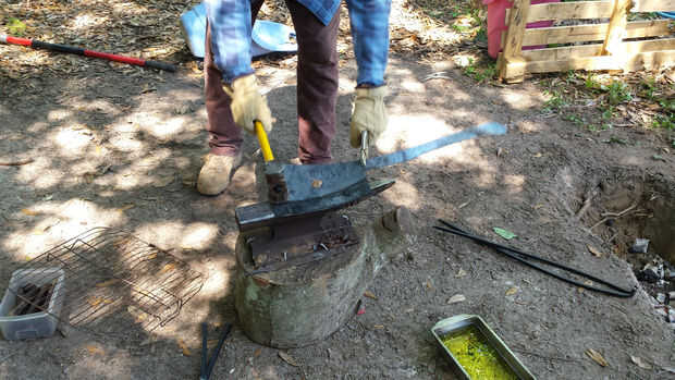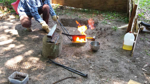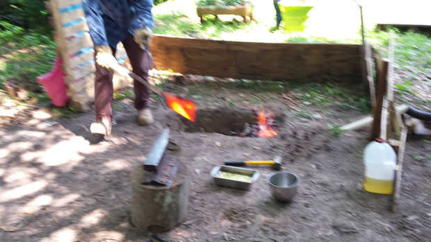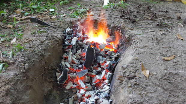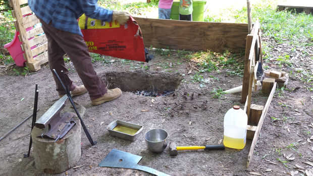 Realmente mucho más fácil que lo que hice. Cavé un 2'x 2' x 3' hoyo en mi patio trasero y encaja la bestia de sangre entera. Cavaron un túnel en un ángulo en la base del hoyo y me empujó hasta la mitad un tubo de PVC. Un shopvac invertido sirvió como mi ventilador para elevar la temperatura hasta niveles de forja, y que unida al del PVC. Un fuego de carbón en teoría funciona bien para esto (ya que hace miles de años antes que yo).