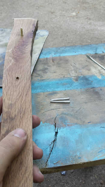 Martillado (al menos pensaba que era una palabra y no un sucio) algún alambre de aluminio hasta que los agujeros había perforado y luego cortar dos piezas para pernos. Por alguna razón quise hacer dos latón y aluminio dos por variedad. El latón eran simplemente los tornillos de latón que tenía en mano.