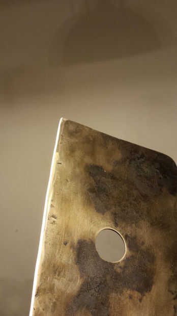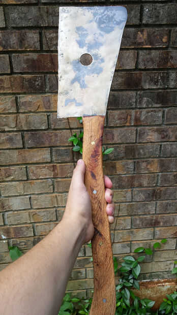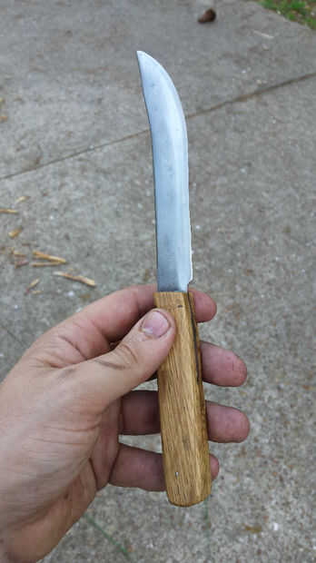 Al día siguiente, me todo había aflojada y había martillado las clavijas (ahora remaches) planas. Me thenrounded hacia fuera los bordes de la manija con algún papel de lija de grano 120 y luego 220 y engrasado el mango con un esmalte de aceite de cera de abejas/naranja (Howards Feed-N-Wax).