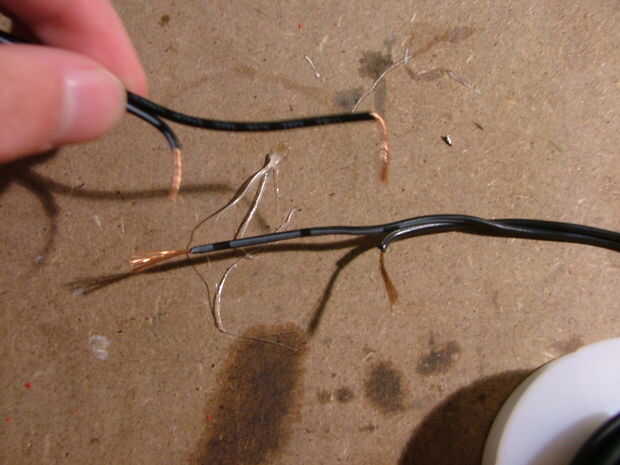 Corte el cable para que los cables positivos y negativos son escalonados como en el primer cuadro. Asegúrese de que tienes suficiente cable para que el LED se sentará con uno a cada lado del orificio en el tubo.