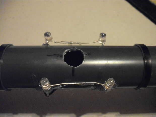 Los conjuntos completos de LED a la tubería en la parte superior los agujeros en el tubo con cinta. Asegúrese de que el LED está apuntando hacia el exterior, en la misma dirección del agujero. Luego hacer lo mismo para el resto de los conjuntos de LED.