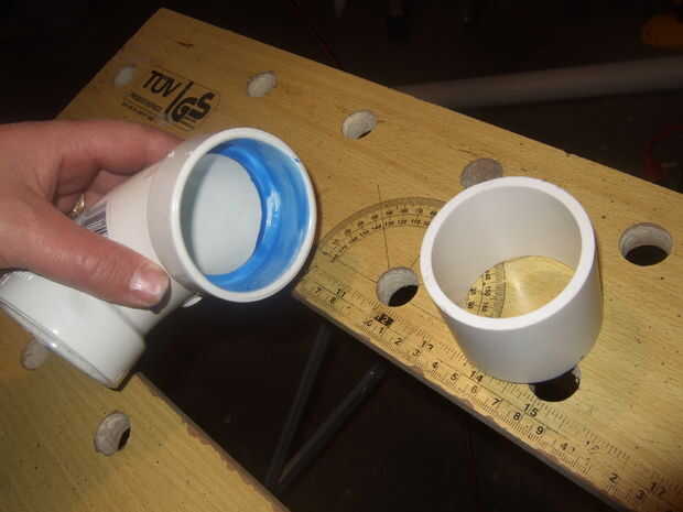 - Pegar un trozo de 6 cm de tubería de 2" a cada una de las curvas. Estas son para los accesorios de la manguera.