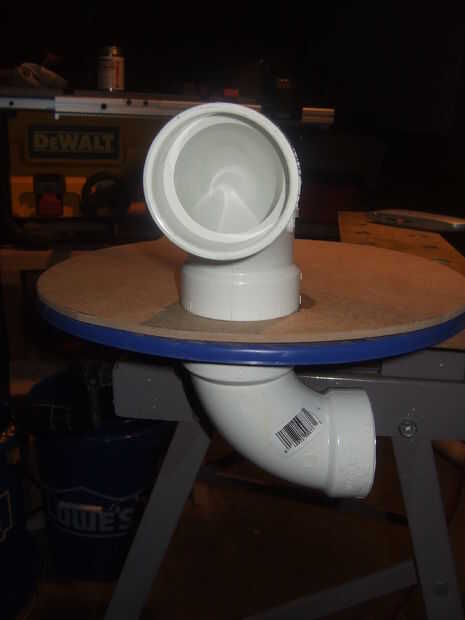 - La tercera curva en el tubo del pegamento y deje secar. Tenga en cuenta que he utilizado un acoplamiento extra y longitud de tubería en mis fotos. Estos no son necesarios. Usted puede ir directamente a la curva. También asegúrese de que está apuntando la curva en una dirección que es conveniente para la colocación de su aspiradora de taller. He utilizado un ángulo de 90 grados entre curvas.