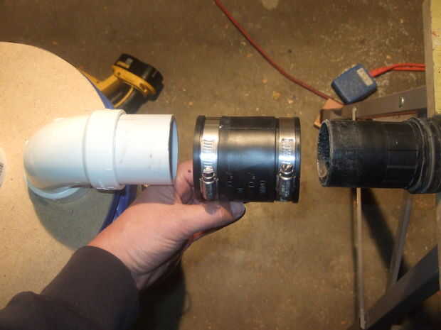 3. Coloque el segundo flexible 2" acoplamiento a la manguera y el tubo de PVC que sale de la tubería de otros / entrada del separador de polvo. Esta manguera se conecta a su sierra, fresadora, cepilladora,. En la foto esta manguera es el nuevo brillante negro.