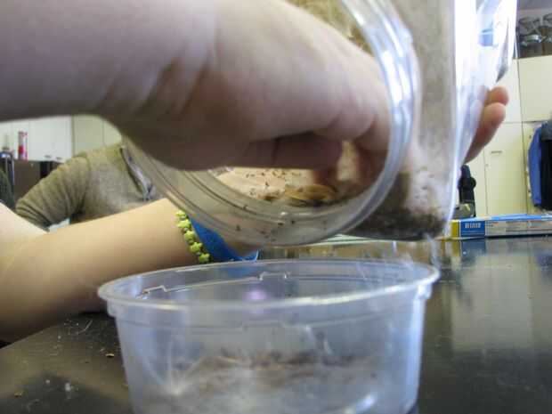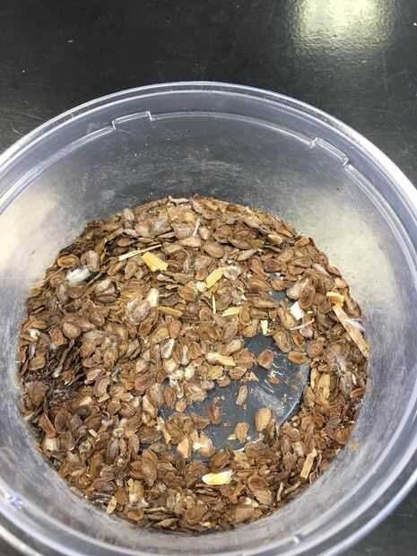 Las semillas deben acumularse en el fondo del recipiente. Para quitar las semillas, sacar las bolas saltarinas en primer lugar, luego con una mano, mueva el hilo dental a un lado del contenedor mientras inclina la parte inferior hacia arriba. Verter las semillas en la bolsa de plástico u otro recipiente en el que quiere recoger las semillas.