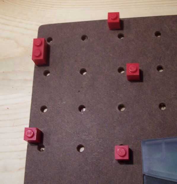 (1) Coloque los separadores de Lego sobre la superficie de montaje en un patrón compatible con los bordes de la placa de circuito. Encontrar lugares en el circuito donde existen componentes, tierras ni rastros.