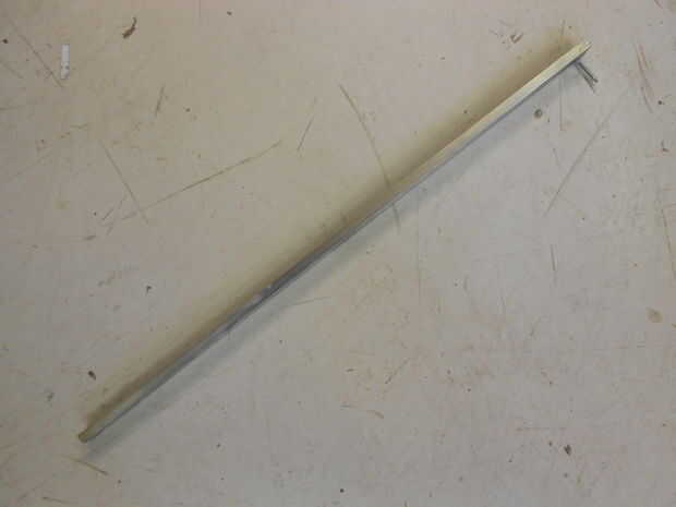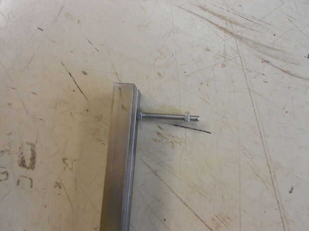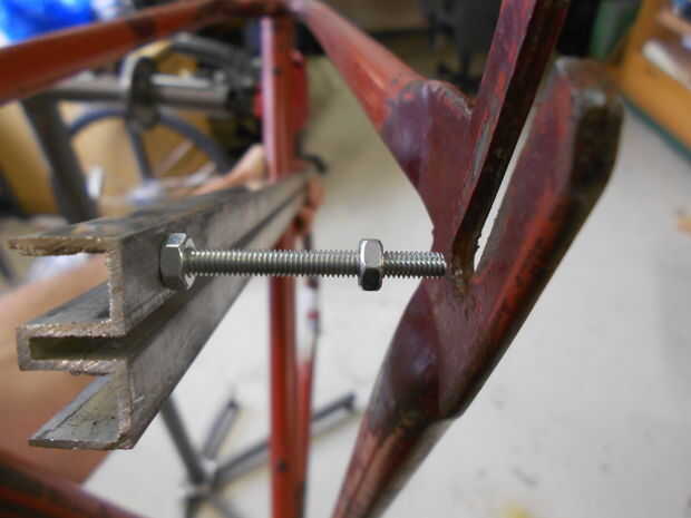 Tomé un carril de aluminio, un tornillo y algunas nueces. Luego perforar un agujero en un extremo del riel y fija el tornillo a través de él con una tuerca. La tuerca se sienta perder el tornillo y se utiliza para comparar el lado izquierdo y derecho de la horquilla trasera pulsando el riel firmemente al tubo de dirección y tubo de sillín del cuadro de forma que el tornillo de puntos a través de los orificios del eje. Como esta usted puede encontrar que lado de la curva en (lado derecho en mi caso) y qué lado para doblar hacia fuera (lado izquierdo aquí).