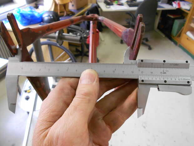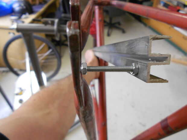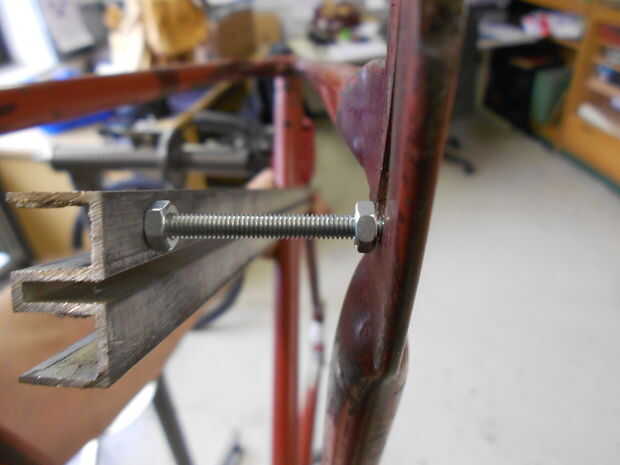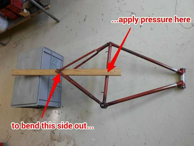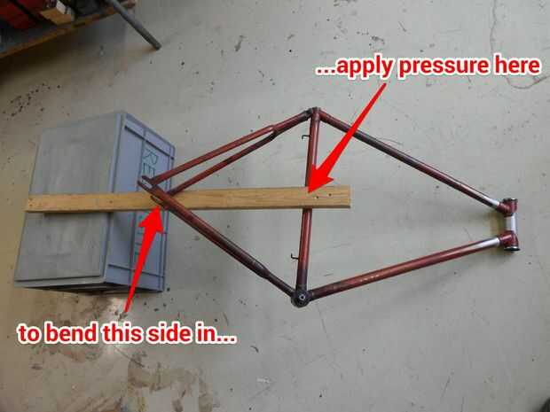 Tome la caja o algo similar (escalera, silla) como punto de apoyo y la pieza de madera. Pegar la madera a través del marco según el resultado deseado: doblar hacia fuera a través de ir medio al tubo de sillín, para doblar en ir de fuera al tubo de sillín (cuadros de verificación para una fácil referencia) de manera que el extremo más largo de la madera se basa en el cajón y la otra en el tubo de sillín y el tubo de dirección de la moto se apoya en el piso. Ahora aplicar la presión en el tubo de sillín, mejor en un firme empuje corto.