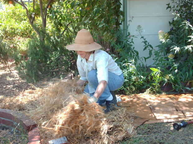 Ahora, cortar los lazos de su primera bala de la paja y comienza a poner hacia fuera, una escama a la vez, en su cartón. Revuelva para arriba y tratar de crear una capa uniforme. Si usted tiene un montón de paja, hacer capas gruesas - usted no puede ir mal. Esto también se descomponen y se convierten en parte de su nueva tierra.