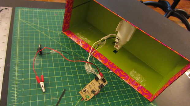 Hacer un agujero de 1,5 cm x 1,5 cm en el centro de la caja (en la parte inferior).