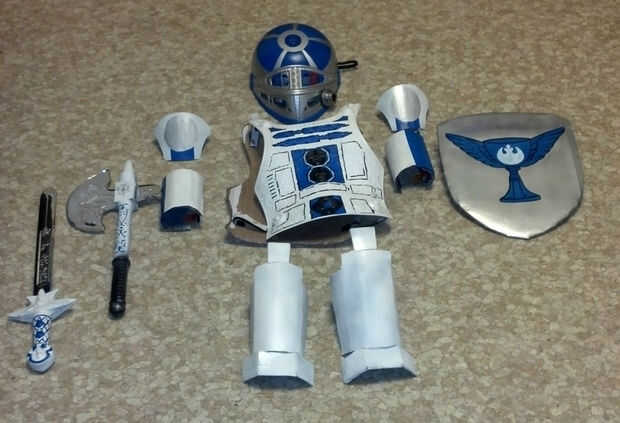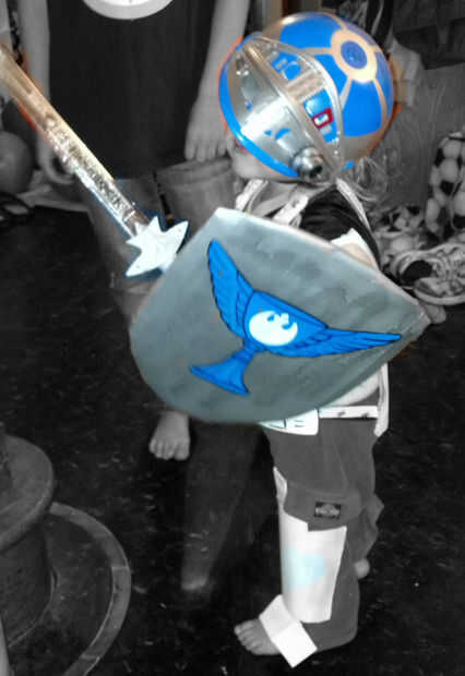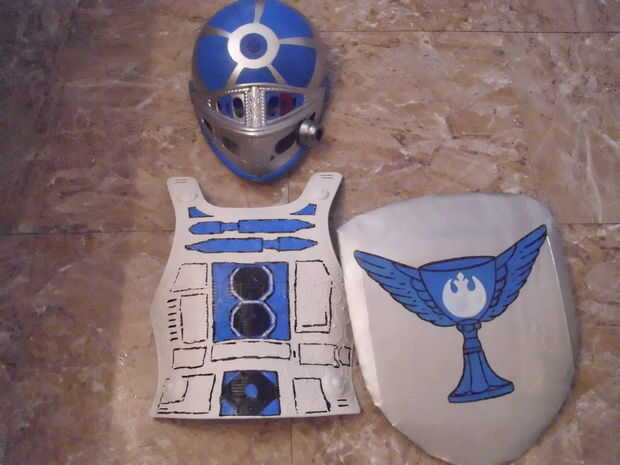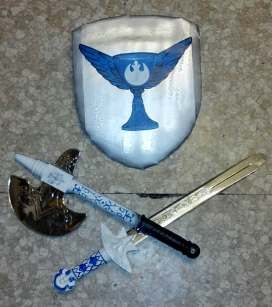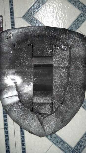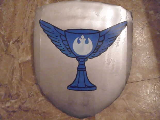 The Shield - un pedazo de cartón corrugado doble corte en forma de escudo. La forma del escudo también fue cortada de la cartulina de la caja de cereal pero 2 pulgadas más grande. El cartón de la caja de cereal era caliente pegado a la forma del escudo de cartón corrugado doble. La caja de cereal exceso fue envuelto alrededor y caliente pegado abajo. Se añadió una manija hecha de cartón. Luego preparado y había pintado de una capa base antes de la Armería de pintura de la mano. Finalmente, se fue todo sellado con laca transparente.