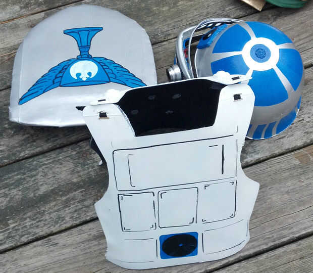 Espinilleras, brazales y hombreras - cartón corrugado doble humedecido y en forma. Una vez seco que envuelto les en cinta para la durabilidad del embalaje, entonces intercala entre pedazos de cartulina de la caja de cereal. Imprimada, pintada y sellada con laca transparente.