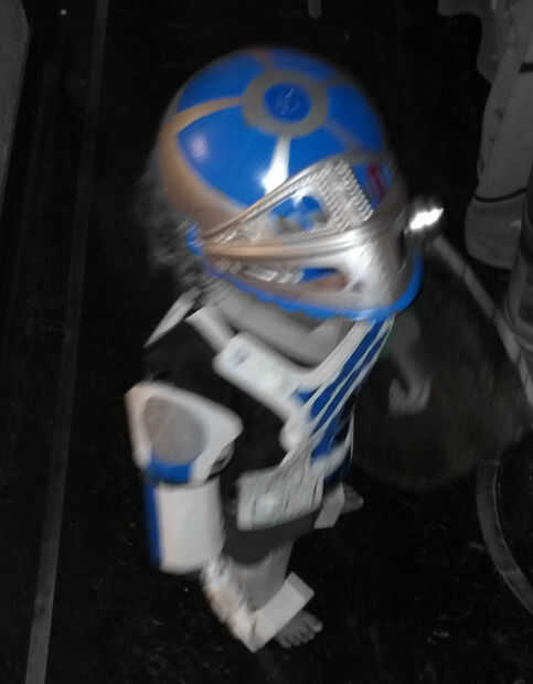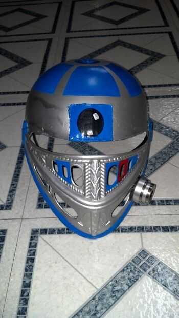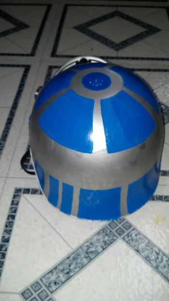 Casco - $1 Dollar Tree - aerosol pintado plata, pinta las formas geométricas, pegamento caliente unos lentes de cámara a mano y atado a una correa elástica para mantenerlo en su lugar. Sellado con laca transparente.