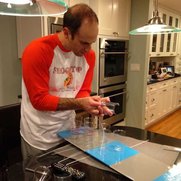 Marca donde estarán las tazas (clavijas).  Use una navaja y un zipties para asegurar 10 onzas tazas claro Solo a la cartulina, en el patrón alterno uno de peg peg/2 del telar original.  Colocar frente y hacia atrás con cinta azul, asegurándose de que la cabeza del usuario pueda caber a través de.