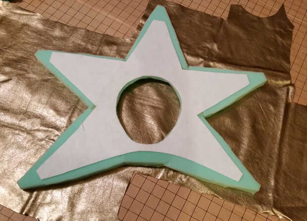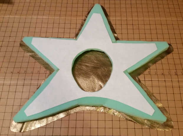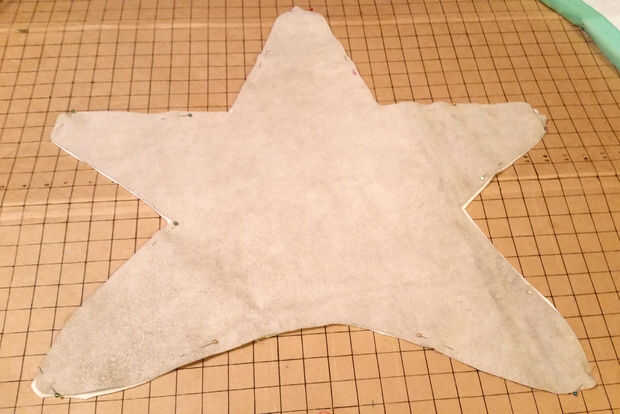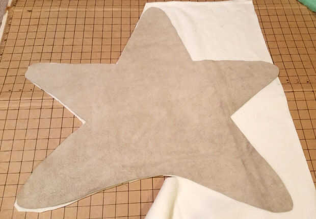 Utilizando la espuma estrella como patrón, corte 2 piezas de tela de aproximadamente 1 pulgada más grande alrededor de todo el camino. A partir de la parte inferior, cosí una puntada recta toda la manera alrededor de la estrella y la izquierda una abertura de 6 pulgadas de ancho en la parte inferior.