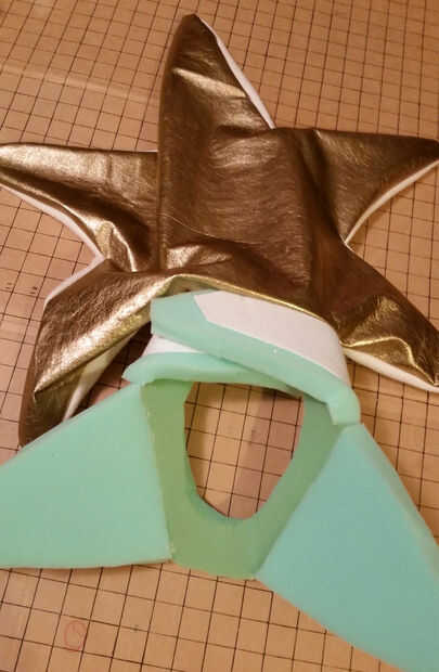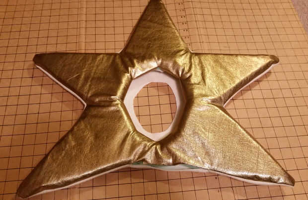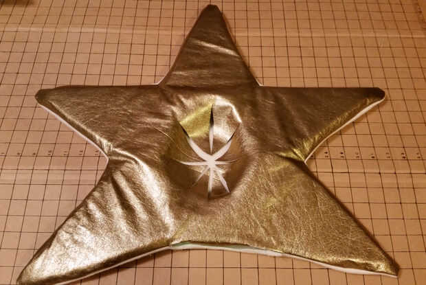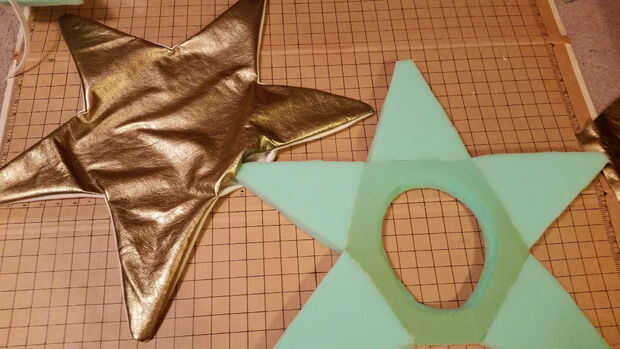 Resultan su derecha estrella cosido a máquina y con cuidado, inserte su estrella de espuma a través de la abertura en la parte inferior. Doblar los triángulos hacia adentro y facilitar en sus ranuras adecuadas. Una vez que la espuma esté en su lugar, recortar el agujero de la cara para que su tela es sobre una mitad de una pulgada más allá de la espuma. Ya utilicé cuero por un lado, tuve que cortar ranuras en el cuero y doblar y pegar hacia adentro.