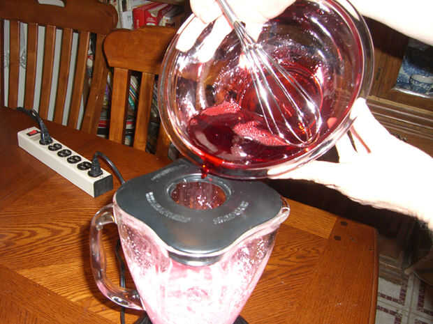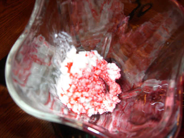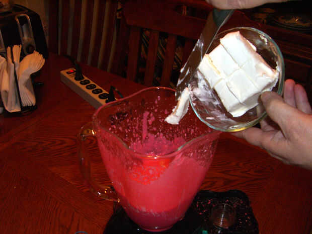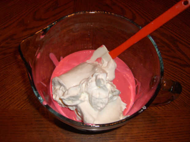 Lugar de Queso Cottage y un poco de la gelatina enfriada en la licuadora. Mezclar a velocidad alta hasta muy suave. Agregar el restante de gelatina y mezclar otra vez