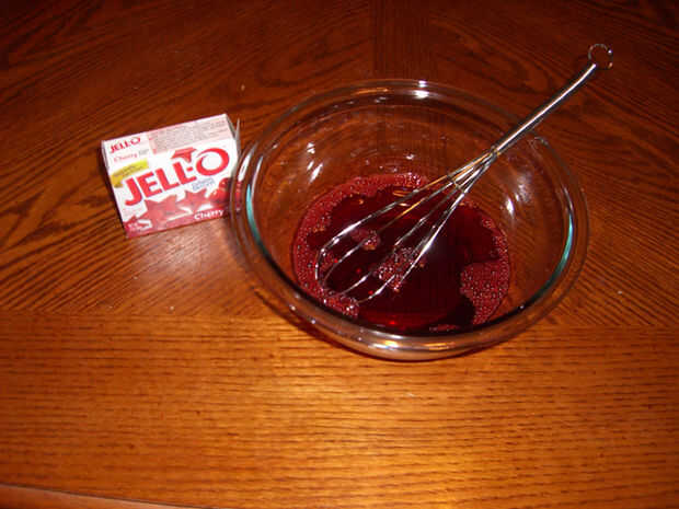 Agregar agua hervida en la gelatina, remover hasta que se disuelva (2 minutos mínimos). Deja enfriar por cinco minutos.