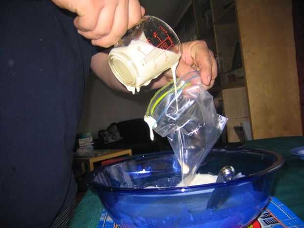 Vierta parte de la masa en una bolsa ziplock. No te preocupes derrames porque rara vez conseguirlo todo sin chorrea algunos abajo del lado. Una vez que la bolsa está cerrada, puede lavar el exterior con agua para reducir aún más lío. Punta la bolsa boca abajo y cortar unos 3 mm en una esquina de la bolsa. El tamaño del agujero es dependiente en el grueso de la masa y es algo que usted necesita para experimentar con. Si encuentras que el agujero es un poco grande, puede cinta cerrada y cortar la otra esquina.