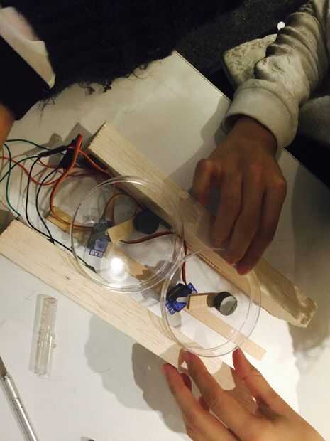 Cinta adhesiva los trozos de cinta de cobre con la tierra y la salida de LEDs en la parte interior de una plataforma y un pedazo de cinta de cobre en la parte interior de la otra.