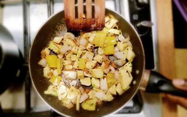 3. Coloque una sartén pequeña antiadherente horno prueba (aproximadamente 20cm) en un medio - alto calor un agregar una cucharadita de aceite de oliva (yo usé sprays de 3-4) y luego saltear las cebollas, chiles verdes, calabacines y pimientos. Añadir una pizca de sal, 1/4 de pastilla de caldo, una pizca de hierbas provenzales (orégano, Romero y tomillo)