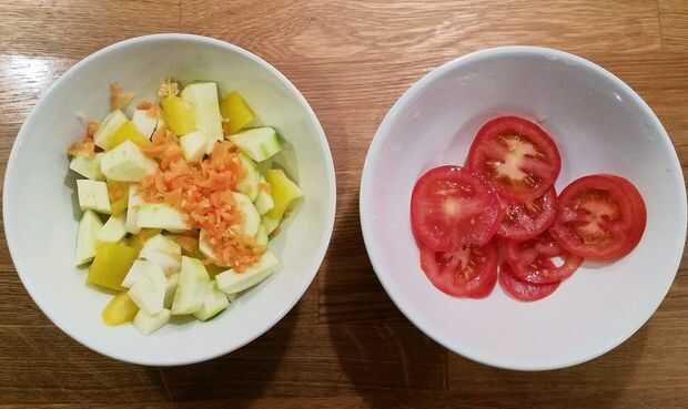 2. Picar la cebolla, chiles verdes, calabacines, tomates y pimientos. Dejar de lado los tomates en rodajas.