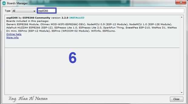 6. Escriba esp8266 intro el campo de búsqueda para instalar plataforma de ESP8266