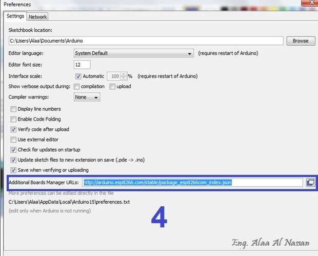 4. Introduzca http://arduino.esp8266.com/stable/package_esp8266com_index.json en campo de URL Adicional encargado de Junta .