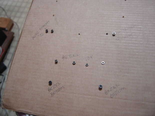Comenzar por la herramienta de curiosos fuera con un destornillador pequeño o similar los topes de goma que sirven también como cosmética de las cubiertas. Coloque cada tornillo en la apropiada ubicación relativa en el organizador de cartulina. La última imagen que muestra el botón eliminar y la cabeza del tornillo está fuera de foco porque la cámara está teniendo un momento muy difícil con las superficies reflectantes.