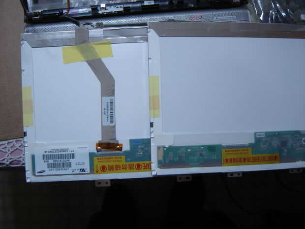 Un trozo de cinta visible tiene el cable de cinta en su lugar en el panel antiguo y un trozo de cinta "invisible" es el conector en la toma de corriente. La leyenda cerca del conector dice "conector de cierre" pero todavía utilizaban un pedazo de cinta adhesiva para mantenerlo allí. Tire con cuidado ambas piezas sin el panel, así como el conector de alimentación que se señaló anteriormente. Ejercer gran cuidado al soltar el conector de bloqueo, ya que es fácil dañar el cable de cinta. Tenga en cuenta también que el cable de cinta pasa sobre el protector de plástico transparente y luego debajo de ella, para enganchar el conector. Una vez que se desconecta el panel antiguo, deslice uno nuevo en su posición y vuelva a conectar los conectores y piezas de cinta.
