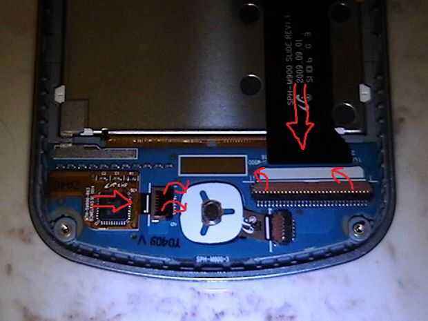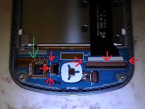 Ahora, inserte el cable de cinta larga en el conector en la dirección de la flecha roja grande (extrema derecha), alineando las líneas blancas en el cable y la placa de circuito. Presione la parte Marrón hacia la parte superior del teléfono como se indica por las flechas rojas de curvas. Una vez más, debe oír un clic débil cuando se asiente.