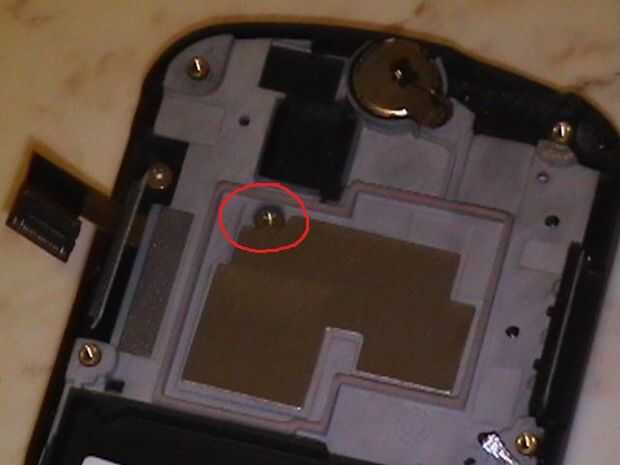 Hay un tornillo cerca de una cubierta de metal que debe eliminarse (indicado por el círculo rojo). Separar este tornillo de los tornillos de la tapa trasera ya que no son el mismo tipo de tornillo.