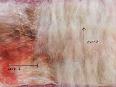 Una vez mojada hasta la primera capa, agregar la segunda capa de fibra. En esta pieza, he utilizado la alpaca cervatillo ligera itinerante para la espalda. Lo importante a recordar aquí es que esta capa tiene que ser perpendicular a la primera. Ej.: Si la primera capa de fibra fue establecida horizontalmente, la siguiente capa debe ir verticalmente. Repita los pasos 2 y 3: tirar mechones finos y poner encima la primera capa. Espolvorear y trabajar el agua con las manos.