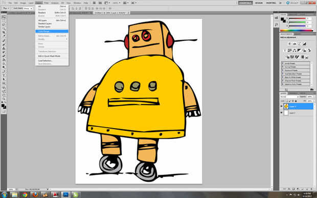 En Photoshop, quiero aislar el trabajo de la línea negra, que puede realizarse a través de "Select" > "Color Range" y haciendo clic en el color desee. Si el archivo está sucio puede que necesite ajustar la tolerancia por lo que es menos específico y seleccionar una gama más amplia de píxeles de que hizo clic. Dependiendo de una amplia gama de variables (demasiados para cubrir aquí) puede que necesite ajustar los niveles (Ctrl+l) o desaturar la imagen en escala de grises (Ctrl + Mayús + U). También se pueden encontrar bajo "Imagen" > "Ajustes". Jugar con los cursores y recuerda que el resultado final es esencialmente blanco y negro plantilla – la parte que mantenga y la parte que corta.