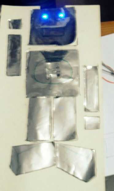 Conecte los LEDs azules 2 juntos [para los ojos] y la tierra al común terreno de Arduino y la alimentación positiva de cable a otros pines digitales del Arduino [3 a 7 fueron los pines donde conecté las salidas y 8 a 12 eran los pines de entrada]