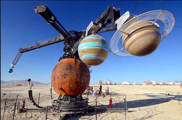 Mecánica celeste es una 16-pies altura cinética escultura de acero de nuestro sistema solar que representa la majestuosa danza de los astros. Fue creado por un equipo dirigido por Jessika Welz para 2014 de hombre ardiente.