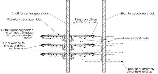 Controlar la velocidad soltando el disco fuerza y dejando cosas ralentizar un poco a la vez parecía la forma más práctica de adelante-el par sería importante y el motor funcionaría a una velocidad constante, por lo que parece más fácil dejar que la hoja par un poco a la vez que tener algún mecanismo para agregar par un poco a la vez. Terminé yendo con un gearset planetario, donde tendría lugar la jaula que encierra los engranajes de planeta fija por un freno accionado por solenoide, el engranaje de anillo sería conducido por el motor y el engranaje del sol haría el planeta. Habría 8 de estos en una cadena, la velocidad de cada paso en la cadena ser de la anterior por las velocidades de transmisión. De esta manera, podríamos obtener la amplia gama de velocidades que necesitamos sin el salto de velocidades demasiado grande en cualquier un momento.