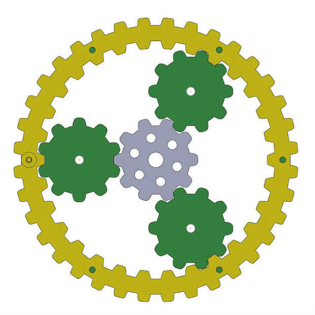 Tocó el violín con los engranajes planetarios durante unos días, y simplemente no parece esperanzador que trabajan. Los engranajes planetarios estaban allí para controlar las velocidades del planeta sólo. Con aproximadamente una semana antes de la pieza enviada, hemos decidido dejar atrás la idea de control de velocidad por el momento. Los planetas todavía de la órbita con las proporciones correctas de la velocidad de uno al otro debido a las proporciones en el resto de la caja de cambios, pero se traban los gearsets planetarios. Sustituimos el engranaje de sol en cada gearset planetario con un "sol-no-gear", encerrados en los dientes de los engranajes planetarios y el gearset todo gire como uno. Salimos de los frenos, cilindros de los frenos y sistema de microcontrolador.