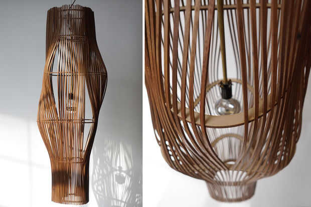 A diferencia de los dos primeros proyectos de esta serie, el diseño de la lámpara de haz surgió no como una exploración formal o material para su propio bien, sino de un deseo de incorporar 'basura' o pedazos de astillas en un objeto, aprovechando técnicas similares como los otros proyectos. Como su nombre indica, hace referencia a un conjunto vertical de hebras (el astillas ¼ "x ¼" nogal piezas estuvieron limitadas juntos en la tienda para almacenar y se convirtió en el punto de partida conceptual). Una simple estrategia para 'pellizcar' y 'tirar' la densidad del paquete condujo el diseño.
