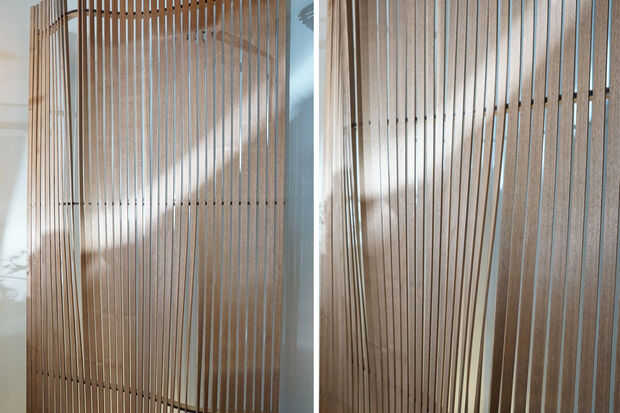 La pantalla de laminillas de ideas en la serie de laminillas y el primer prototipo tiene estas mismas ideas a una configuración espacial más grande. Como una pieza singular, fue diseñada como una malla de divisor visual de pequeña habitación, aprovechando la capacidad de torsión de los listones personalizados rebanadas nuez para modular la visibilidad, sombra y profundidad. Como un sistema potencialmente más grande, la pantalla se puede modificar (a través del modelo paramétrico) para acomodar cualquier número de 'locales' requisitos tales como nivel de visibilidad, densidad de listones, grados de giro, o la cantidad de ondulación. Para este primer prototipo, las tablillas fueron formadas como-es. Mediante la incorporación de vapor al proceso podría lograrse un mayor grado de flexión y formación.