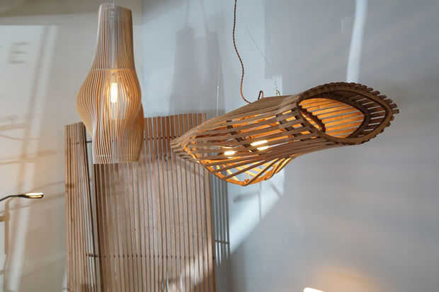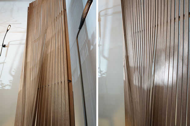 Para un sistema de 'prototipo' esto resultó bastante agradable y fue genial ver esta técnica (usada previamente en la escala de luces) en una escala interior/muebles. La densidad utilizada para esta obra fue sorprendentemente transparente desde algunos ángulos - el espacio entre listones probablemente podría ser aún más estricto. En cuanto a las piezas altamente tensionadas que querían tirar de las muescas - entallado puede ser reajustado para un control más estricto, la torsión global patrones podría examinarse más cerca en el modelo digital (algunos de la torsión trabajó a la ventaja de las articulaciones) y las piezas pueden ser cocidos al vapor (requiere un tubo de vapor 8').