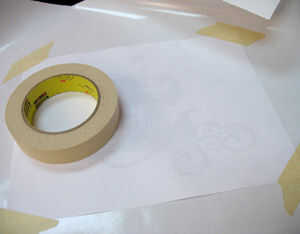 Tener tu imagen (que debe ser marcado en blanco y negro) y lugar de impresión hacia abajo en el lado brillante de su papel de congelador. Cinta adhesiva en su lugar. Cuando se voltee, debe ser visible a través del papel del congelador en el otro lado.