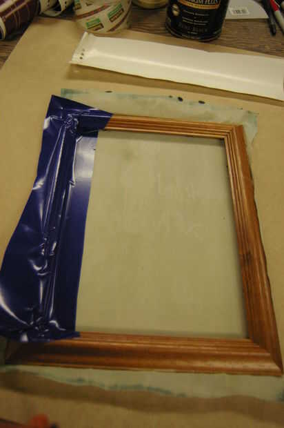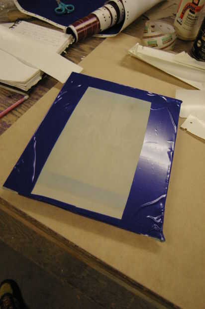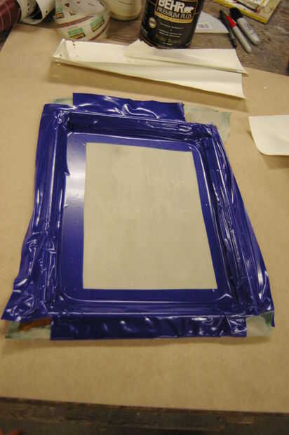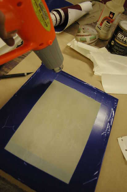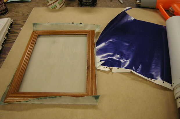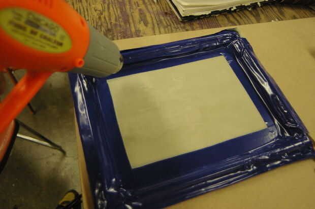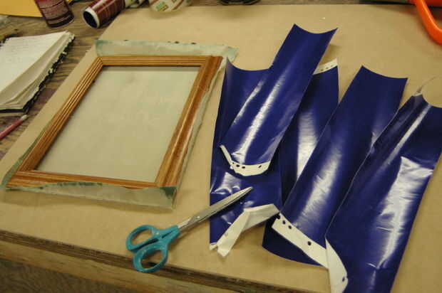 Algunos de los vinilos de chatarra cortada en tiras y pegarla a la pantalla y el marco por lo que no hay espacio vacío para la tinta a pasar. Cubra a la tela todo el camino alrededor de cerca de 1.5" de los bordes del marco.