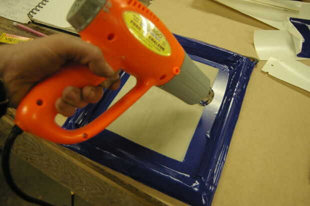 Una vez que el vinilo está todo en su lugar, golpeó con algo de calor y rápidamente pulir plana para el marco y la pantalla con los dedos. El calor será fijar el adhesivo del vinilo y hacerlo firmemente se adhieren a la tela y el marco.