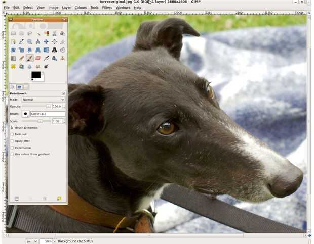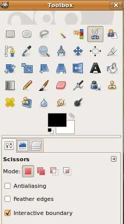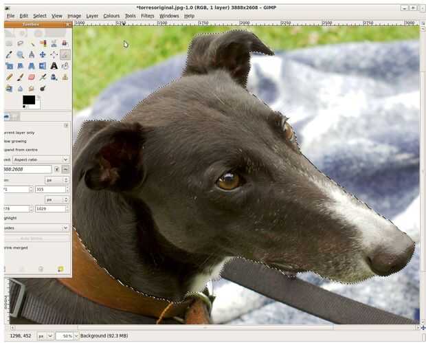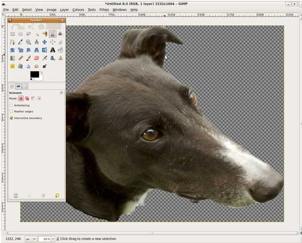 Desde la ventana cuadro de herramientas , seleccione la Herramienta tijeras de seleccionar y marcar la casilla de límite de interactivo . Esta herramienta le permite ' cortar ' alrededor de la parte de la imagen que desea imprimir. En este caso, quiero cortar alrededor de la cabeza del perro, excepto el collar y el fondo.